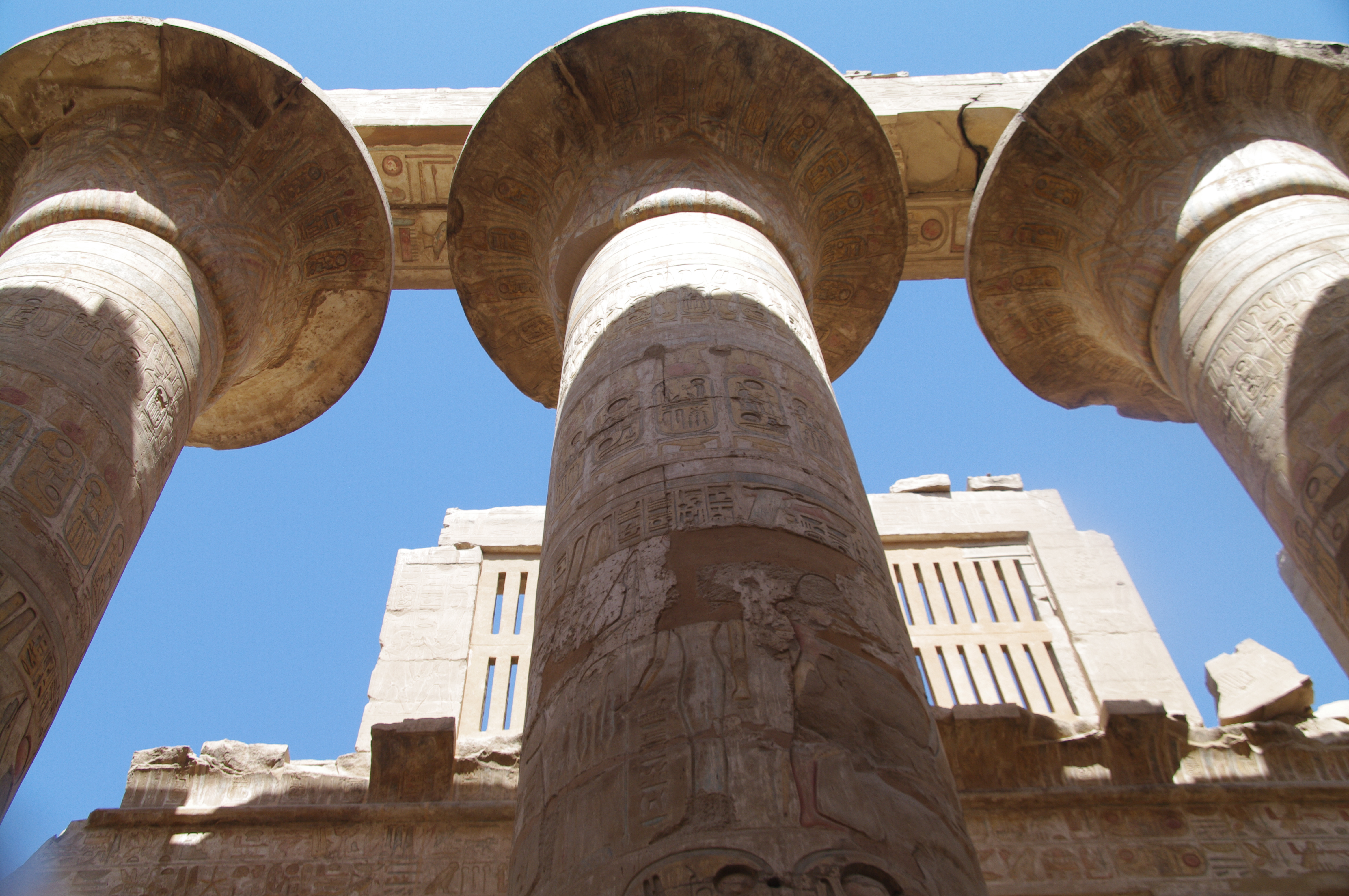 높이 약 23m의 석주 134개 대열주실은 안쪽의 하트셉수트 여왕의 오벨리스크와 함께 보는 이들을 압도한다.